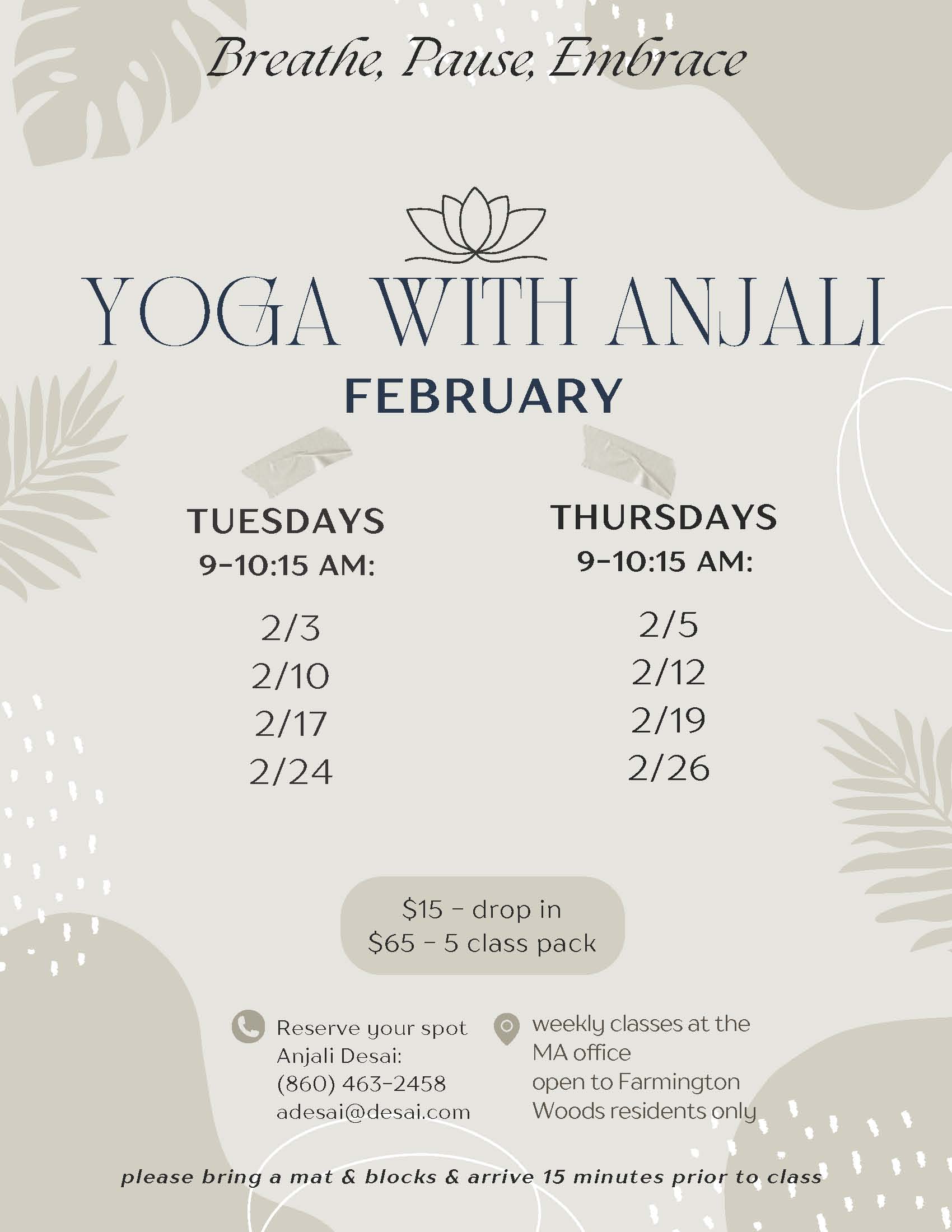 If you are a member of Farmington Woods and are not receiving our weekly email, please contact Jennifer Egan at 860-673-6193 ext. 26 or [email protected] Prime Rib Night: Saturday, February 28, 2026 - click here 1/2 Price Farmington Woods Women's Club Membership - click here CONNECT Presents: Hartford Symphany Orchestra Jazz Quartet February 27, 2026 @ 7:30 p.m. - click here February 2026 In the Woods Newsletter - click here Farmington Woods Cooperative Garden Open House Sunday, February 22 @ 1-3 p.m. - click here CONNECT Presents: String of Pearls Big Band on Feb. 14 at 7:30 p.m.❤ - click here District 9 – Town Hall Meeting February 10 - click here Superbowl Sunday Specials at the Restaurant February 8 - click here Yoga in the Woods for February - click here Please Keep Garage Doors Closed - click here Prevent Frozen Pipes - click here Reminder: Trash Delay One Day This Week - No Bulk Trash Pick Up Week of 1/26/26- click here Farmington Woods Winter Storm Information for January 25-26 - click here Your Table Awaits... Welcome Jenna Cirikovic as our Front of House and Events Manager - click here Farmington Woods District Board Newsletter - Clubhouse Re-Opening - click here January 2026 In the Woods Newsletter - click here Trivia Night February 5, 2026 - SOLD OUT - click here CONNECT Presents: Hartford Symphony Orchestra Jazz Quartet & Special Buffet Dinner January 24 at 7:30 p.m. - Canceled Farmington Woods Cooperative Garden New Gardener Recruiting Drive - click here Sewer Reminders from the Town of Avon: What to Flush and What NOT to Flush - click here Trivia Night February 5, 2026 - click here A Friendly Reminder from The Snow Removal Team - click here The Importance of Proper Footwear in Winter - click here New Year's Closures, Trash Delays, Exterior Winter Holiday Decorations & Christmas Tree Disposal - click here